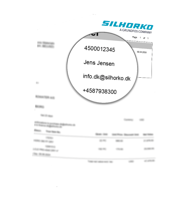 Der skal altid fremgå en gyldig reference på faktura/kreditnotaer. Faktura uden reference kan blive afvist. En gyldig reference er indkøbsordrenr. (4500XXXXXX) eller navn, initialer eller e-mail på din Silhorko-Eurowater kontaktperson.