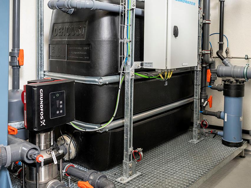 Vandbehandlingsløsningen på Grundfos pumpefabrik består af blødgøring, en vandbesparende enhed der opsamler spildevand og et omvendt osmoseanlæg af typen RO-PLUS med vandbesparende teknologi.