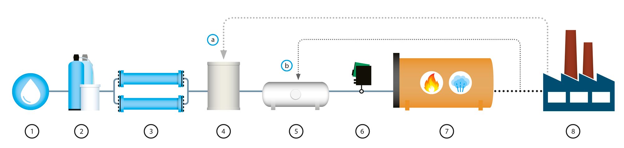 Flow diagrammet viser en optimal vandbehandlingsløsning til industrielle dampkedler.