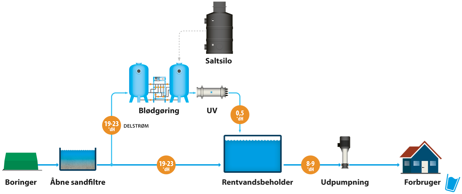 For at Juelsminde Vand kan opnå en hårdhedsgrad på 8 °dH, behandles en delstrøm i blødgøringsanlægget. Det blødgjorte vand UV-desinficeres inden det efterfølgende blandes med hårdt vand. UV giver en ekstra sikkerhedsbarriere mod bakteriologisk forurening, så drikkevandssikkerheden opretholdes.