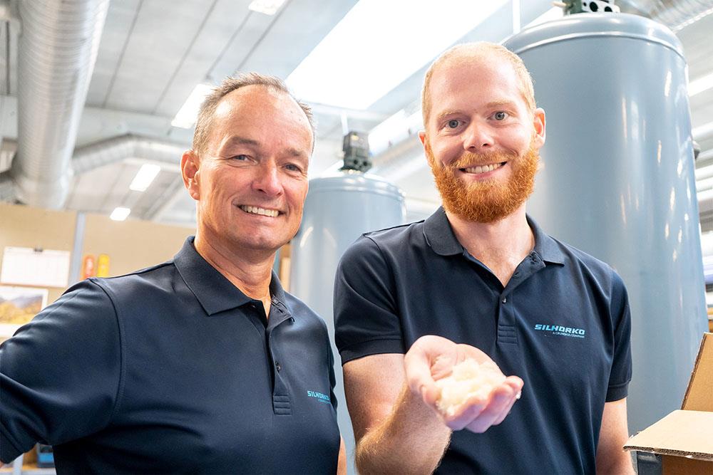 SILHORKOs afdelingschef for Drikkevand, Arne Koch (venstre), og kemiingeniør og produktspecialist indenfor ionbytningsteknologien, Søren Duch-Hennings (højre), er de to nøglepersoner i udviklingen af det innovative anlæg. Her viser Søren den type ionbyttere, der bliver brugt i anlægget.