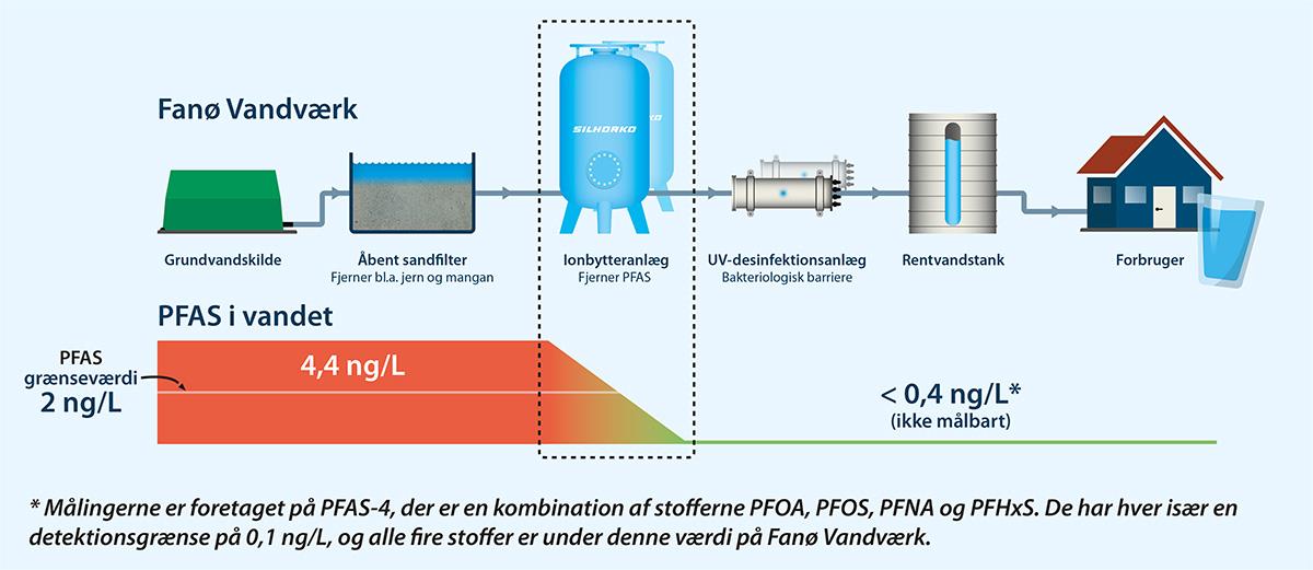 - Slutningen af januar 2023: Det nye anlæg installeres på Fanø Vandværk. Vandanalyser viser et PFAS-indhold under detektionsgrænsen.