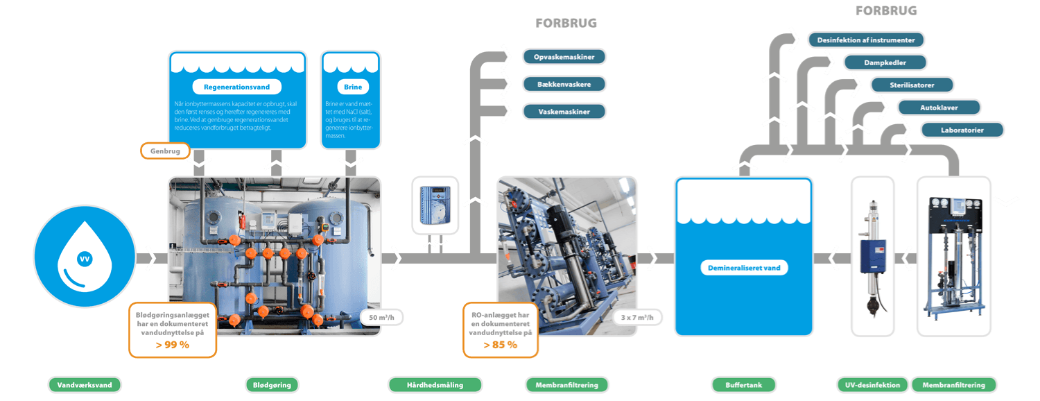En del af det blødgjorte vand anvendes som procesvand i vaskemaskinerne, opvaskemaskinerne og bækkenskyllerne. Den resterende mængde bliver viderebehandlet i tre RO-anlæg.