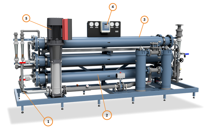 Omvendt osmose (RO) er en teknologi der effektivt eliminerer pyrogener, mikroorganismer og op til 90 % af de organiske stoffer i vandet. Det giver en høj vandkvalitet med lav ledningsevne. Vores RO anlæg er konstrueret udfra et modulært design princip, så de kan tilpasses forskellige krav til demineraliseret vand. Derudover kan alle RO anlæg udstyres med energieffektive E-pumper fra Grundfos og lavenergimembraner, så der opnås et minimalt energiforbrug.