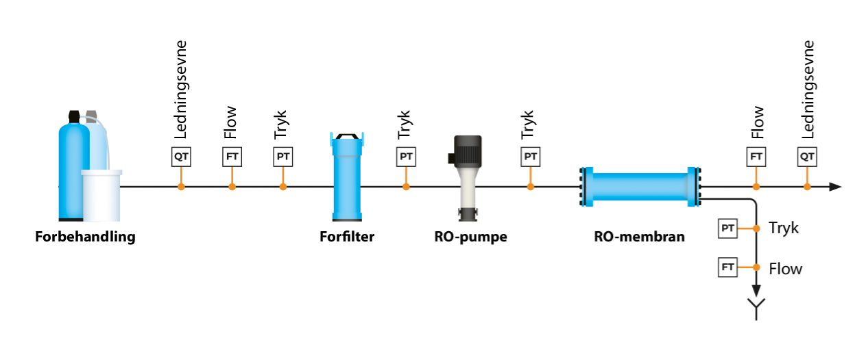 Tilstanden af RO-anlæggets forfilter og RO-membraner registreres ved differenstrykmålinger. - FT - Flowmåler