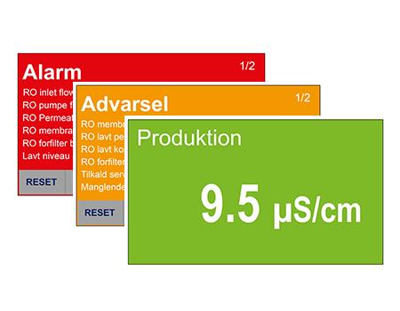 Selvforklarende grafisk brugergrænseflade (GUI). Farveindikationsstatus ved produktion, standby, advarsel, alarm.