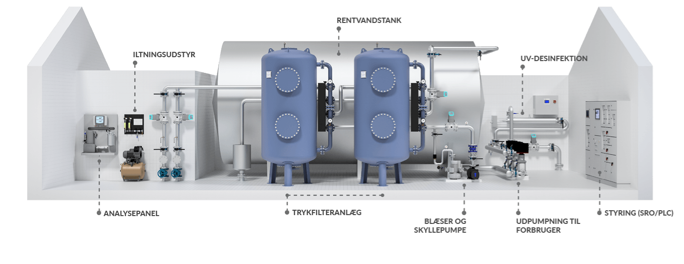 Forsyningssikkerhed, pålidelig drift og automatisering beskriver en moderne vandbehandlingsløsning fra SILHORKO. Illustrationen viser de mest anvendte komponenter og installationer på et SILHORKO vandværk.