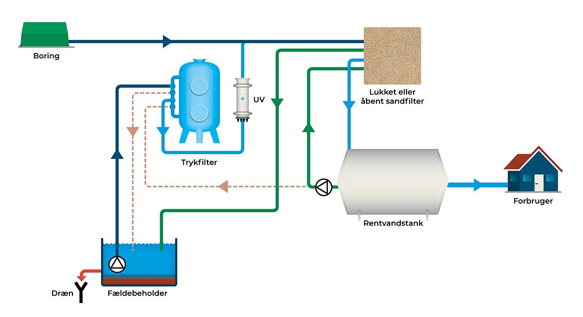 Ved genfiltrering af skyllevandet kan op til 100 % af vandressourcen genbruges. Skyllevandet hentes fra fældebeholderen og filtres i et mindre trykfilter og desinficeres efterfølgende over et UV-anlæg, så vandkvaliteten og driftsikkerheden opretholdes. Skyllevandet er nu blevet til rent drikkevand og kan indgå som råvand i vandværket, der efter en normal filtrering, kan sendes ud til borgerne som rent drikkevand.